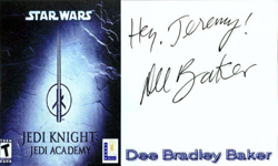Dee Bradley Baker signed cards; obtained through the mail. Mr. Baker worked on the Star Wars video game: Star Wars: Jedi Knight: Jedi Academy (was Jedi 2/Reborn 2/Rockettrooper Officer/Nogrhi), Star Wars: The Clone Wars (2008 version) and Spaceballs: The Animated Series (2008) . |