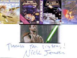 Nick Jameson signed card. Obtained through the mail. Mr. Jameson was the voice of Supreme Chancellor Palpentine in the Clone Wars Animated Series He also did voice work for Star Wars: Dark Forces , Star Wars: Tie Fighter Collector's CD-ROM , .Star Wars: Rebel Assault II - the Hidden Empire , Star Wars: X-Wing Alliance , Star Wars: Episode I - The Phantom Menace , Star Wars: Episode I - Racer , Star Wars: Force Commander , Star Wars: Galactic Battlegrounds , Star Wars: Jedi Knight II - Jedi Outcast , Star Wars: Racer Revenge , Star Wars: Bounty Hunter , Star Wars: Knights of the Old Republic , Star Wars: Jedi Knight - Jedi Academy, and Star Wars Rogue Squadron III: Rebel Strike To see a couple more signatures, go to my Star Wars Video Gamers area. Woah! |