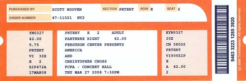 We went to see America and Christopher Cross March 27th, 2008 at the Ferguson Center in Newport News on the Christopher Newport University grounds. We did not catch photos of Christopher Cross. You were NOT allowed to take photos inside the venue; we could take them after and did get a couple (see above) of Jerry and Dewey (America) after the concert. In addition, I got them to sign a CD and that was pretty nice of them. They signed for everyone, took photos, shook hands. VERY fan friendly and thus, shows how come they still can tour all these years; not only is there music classic but the are class acts! Chris did not come outside and greet the masses... the concerts by both were very enjoyable. If attending this venue, realize a couple issues... there is NO food there or allowed inside. You can carry only bottled water inside. They do sell wine and beer in the lobby at most events. The venue, even for rock groups is more dressy. You will be greeted by ushers in tuxedos or such and the venue is a little bit stuffy. There is no water fountains inside that I saw. There are public restrooms. There is no seating outside except a couple benches, so if you get there too early, you'll be standing so wear comfortable shoes. Parking is in the garage and is free. The wait time to get out is not bad at all. Tickets were 42.00 each and you didn't get a hard copy; you printed it off the PC and they scanned it upon arrival. No cameras or recording allowed at any events there. The fee for mailing the tickets to you is expensive (20.00 I think) or you can print them for 2.50. There is NO will call... Wine and beer prices expensive (3.00 for a bottle of water; small one and 6-8 for beer/win per glass). There is sometimes a small table with merchandise set up to buy T-shirts etc but oftentimes not.
