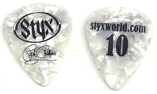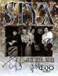Left to right: 1) The whole band taking a bow 2) Lawrence Gowan and Tommy Shaw panoramic shot during "Miss America" 3) James Young, Lawrence Gowan and Tommy Shaw 4) Styx signed CD obtained at the concert 5) two Styx Picks (Ricky Phillips obtained at the concert)