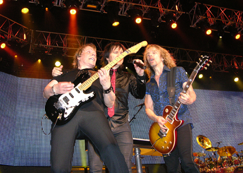 1) James Young, Tommy Shaw, Ricky Phillips and Todd Sucherman 2) The end: them taking the final bow 3) Tommy Shaw with Lawrence Gowan in the background 4) A great shot of them having fun 5) Todd Sucherman (?) Tommy Shaw