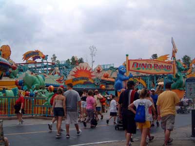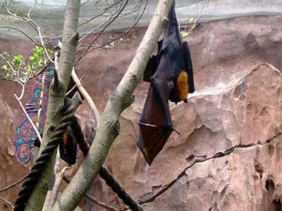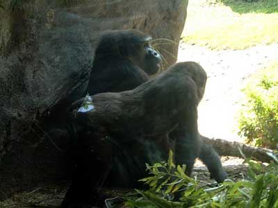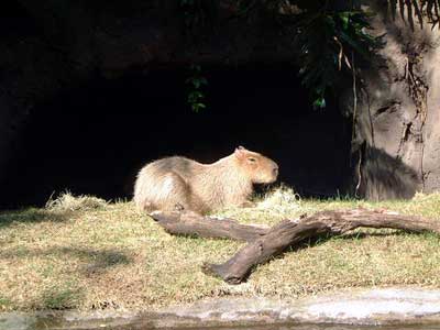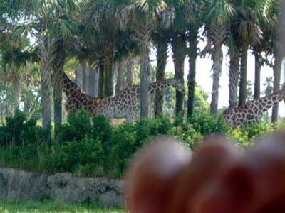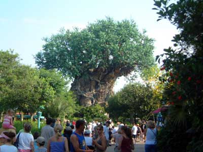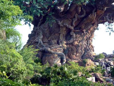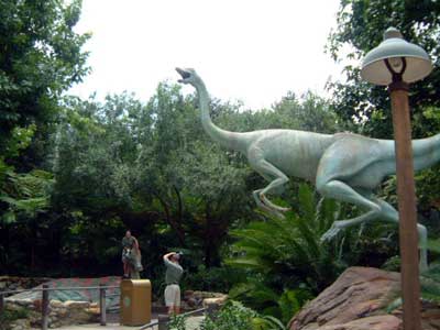 June 1st, 2003 Animal Kingdom, Walt Disney World, Orlando, FL June 1st 2003, Day Three: Per our usual time up and breakfast at same place as day before and at the free shuttle by 8:30 am. We caught a Disney shuttle from the ticket/transportation center to Animal Kingdom. It was scorching heat already. Taking a tip from an Australian man I talked to the other day, we headed up to Kilimanjaro Safari but on the way we pass and go through The Oasis Exhibits. I spied a large rodent thing (the size of a dog) and a Macaw or two and some birds. and I see a rabbit, just walking down the trail inches from me. The Tree of Life is in the middle of the park and we pass it heading to Kilimanjaro. With over 350 carvings in it, I take a couple photos. Actually, this tree is ENORMOUS, but not real. Around the tree are some short trails to follow called the Discovery Island Trails. Some birds and plants and a couple animals reside there, and we see the lemurs and tortoises and Tamarins. But having seen these in zoos before, I don't snap photos. We reached the Kilimanjaro Safaris and get a fast pass so we don't have to wait. In the meantime, we Ride the Wildlife Express Train that takes us to one petting zoo area. We don't get out though and opt to ride back to the same place we just were and get a soda and wait. Having been on numerous trains before, we opt out of the photo op. Back at the Kilimanjaro Safari, we get on a jeep-like tram. We see a few Rhino, Giraffe, two Lions sleeping and some elephants. We chase imaginary "poachers" and see where they set up camp; we also see the aftermath of their capture by the preserve agents. The most impressive site was the Giraffe. On the way out of the ride, we hit the Pangani Forest Exploration Trail where we see birds, fish, gorillas and hippos. Here's a photo of some Gorillas, which we snap photos of. Not thrilled by anything I saw other than the Giraffe and Gorillas, I want to see big cats... so it's off to Asia. But before that, we see a ride that looks good and wet (we are soooo hot). So we get a fast pass for the Kali River Rapids and decide to eat lunch while we wait. Unfortunately it's potstickers and some sort of Asian food I am not sure what it is, so we look somewhere else and there's no food ANYWHERE! But we do find a place that serves nothing but McDonald's fries and that and a diet Coke ends up being our lunch. Time for the Kali River Rapids! Nice ride, but too short. Only one large dip to get wet on, but that was really fun! We didn't snap a photo. To dry off, we go up the Maharajah Jungle Trek where we see Fruit bats (photo below), birds, tapirs and Tigers (photos below). I didn't see the Kimono dragons they said were there. Wonder how we missed them. We know the park closes soon, so we head to DinoLand USA, but not before getting some ice cream to cool off. When we arrive at DinoLand, we look around what appears to be a carnival. A few games at the Fossil Fun Games area that are giving away Dinosaur prizes for wins...only is $2 each shot. We opt not to play. Everything looks garish here. We see two kids rides entitled Primeaval Whirl which I kind of want to go on. It's a small rollercoaster I think I can handle and I see adults on it. But we pass. Likewise for the TriceaTop Spin. It's a kids ride too, but adults are on it with their kids. We pass. I look at the parks main attraction, a massive dinosaur called Dino-Sue. I thought I took a photo, but apparently I did not...or accidentally delete it; too bad because we here Disney workers think this is the pride of Animal Kingdom (it's animated and pretty realistic). We are leaving soon because I am pooped and so sunburned and blistered I can't stand it. But I see on ride which looks promising and I decide I can sit in Air Conditioning, so we do it! I am glad we did as this was the single best thing about the park! It's called Dinosaur and it was indeed a scary ride. The little boy next to me was so scared he cried. It's fast, bumpy and big things come at you. Very fun. I didn't get any photos because it moves too fast! However, Scott posed with a dinosaur outside and I snap a photo of that and another as we leave. We get sodas, and we see on the map only one more thing worth doing and it's on the way out so we go for it. It's called "It's Tough to be a Bug!" But this brings me the most anxiety I had the whole time. We were crammed close together and in extreme heat and it was dark. With people so close to me for a long period of time and being so hot and tired and unable to see (everyone's bigger than me) I get a panic attack of sorts. Finally, we get in and just in time! I am ready to freak out. It was poorly run. My only complaint about any of the parks thus far. The show itself is really cute though and even Scott likes it. It's another 3-D and reminds me of the Muppets adventure in the other park. For sure I am ready to leave, so we catch the bus back to the Ticket/Transportation center and then the hotel bus back to the hotel. We are home early and decide to go to dinner and the grocery store for supplies. We eat at an Italian Restaurant. I get spaghetti and Scott gets manicotti. We both get a salad and a diet soda. Cost? $35. Expensive for what it was (not very much and the restaurant wasn't very nice looking and the service was not great considering nobody in there; plastic cups etc). We head back to the room and pack because we are leaving for home the next day. We watch a bit of TV and sleep... What we missed at the Animal Kingdom: Pocahontas and her Forest Friends (a children's show), Festival of the Lion King (music, dance, stage performers), Habitat Habit! (a discovery trail with backyard animals like rabbits, squirrels and barnyard animals). Affection Section (petting zoo), Flights of Wonder (bird encounter area like a sanctuary I guess), The Boneyard (a playground for kids to climb on etc) and finally, Tarzan Rocks! (A stage show with Jugglers etc.) No big loss on any of these but if I